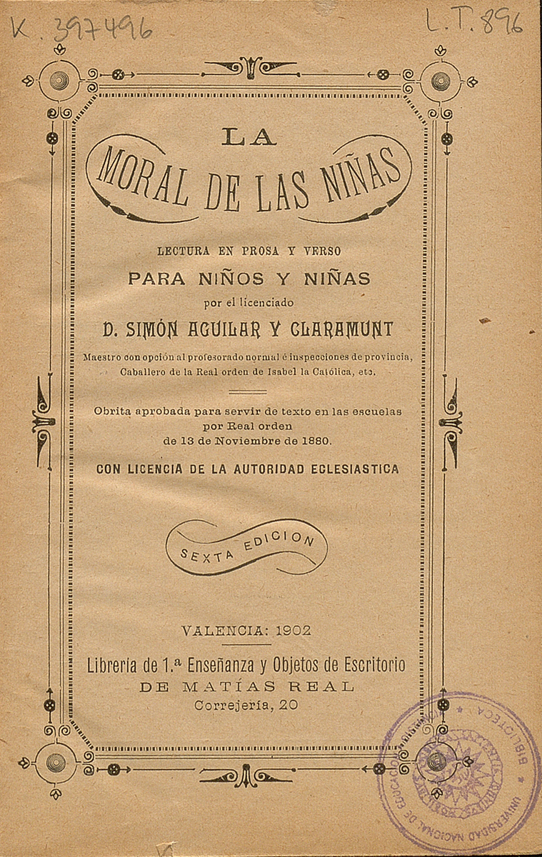 En port.: Obrita aprobada para servir de texto en las escuelas por Real orden de 13 de noviembre de 1880. Con licencia de la Autoridad eclesiástica