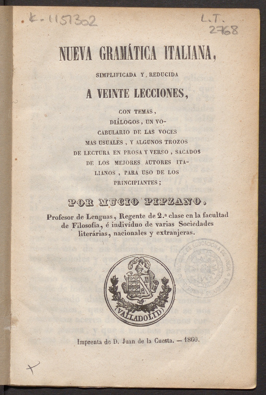 Nueva gramática italiana, simplificada y reducida a veinte lecciones, con temas, diálogos, un vocabulario de las voces más usuales, y algunos trozos de lectura en prosa y verso, sacados de los mejores autores italianos, para uso de los principiantes