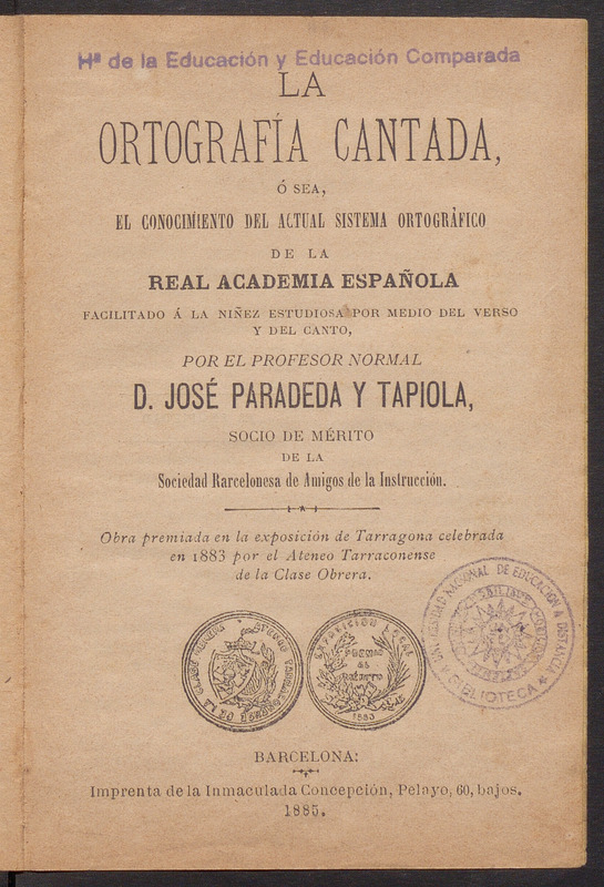 En port.: Obra premiada en la exposición de Tarragona celebrada en 1883 por el Ateneo Tarraconense de la Clase Obrera
