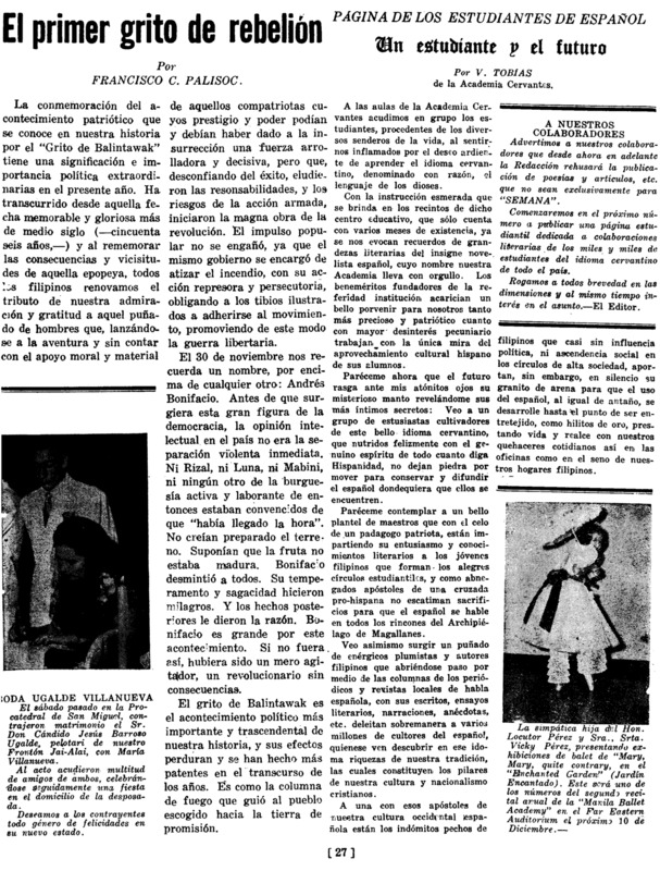 Semana Revista ilustrada Hispano-Filipina was an illustrated magazine published weekly in Manila by the Spaniard Manuel Lopez Florez. Semana was created in 1948 and lasted until 1955. It was backed by Tabacalera and Cervecería San Miguel, and had important Spanish-speaking Filipino intellectuals as collaborators, such as Jesús Balmouri, Claro M. Recto, or Manuel Bernabé. As a response to Elpidio Quirino’s initiative of turning the Cry of Balintawak a national holiday in 1950, Francisco C. Palisoc wrote an article where he commemorated the event as the starting point of the independence and attacked the Filipinos who, having more prestige and power and so the potential to give the insurrection an overwhelming and decisive force, didn't trust the insurrection and avoided their responsibility and the risk of an armed fight. Palisoc criticized the repression by the Spanish government, which only stirred a public opinion that already supported the insurrection, and praised Bonifacio as the only one who believed that the hour of independence was near, guiding the Filipinos to the promised land of independence when neither Rizal nor Mabini though the Filipinos were ready.- Fecha
