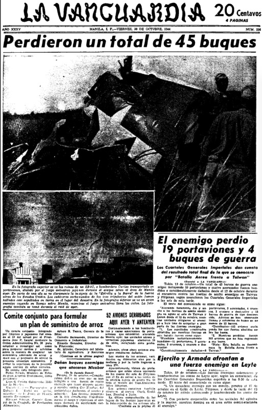 The conflict, which was divided into a series of smaller battles, started that day but would finish on the 25th with the destruction of the Japanese fleet and the break of Japanese supply lines to South Asia. A massive Us victory (although La Vanguardia would still announce their defeat on the 26th) would pave the way to a US landing in the Philippines and the bloody Philippines campaign, which ended with the destruction of Manila, and the newspaper.