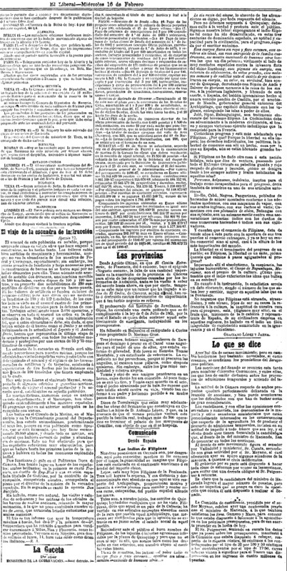 Lopez Jaena, Graciano. 1887. “Comunicado desde España. Los indios de Filipinas.” El Liberal IX, num. 2, February 16, 1887. P. 2. Held in Hemeroteca Digital at Biblioteca Nacional de España.