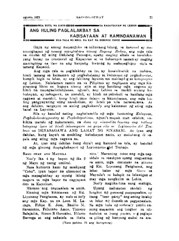 Domingo Ponce, along with Crisanto Evangelista and Cirilo Bognot, was the founder of the "Partido Obrero de Filipinas" (Labor Party of the Philippines). Founded in 1924,this organization saw itself as the antithesis of colonial political parties and went so far as to label other politicians as "traitors to independence" (Constantino, 1975, P. 360). A year before the establishment of the organization, this article, written by Domingo Ponce, was published in the Bogang-Buhay newspaper. Much like other travelogues in which authors include similarities to their homeland, the article shows how members of the Lehion Lodge hold on to their homes. More specifically, the members leave Manila for Cebu, but when their boat gets delayed they rejoice in the fact that they get to stay in the city for a few more hours. Moreover, when the boat eventually does depart, the members keep their eye out for Manila until the city is no longer visible. It is interesting how, in their purpose of building a nation, travelogues served not just as a point of comparison when writers traveled abroad, but also as a way to explore and make their own country known.