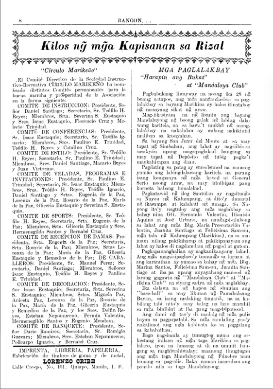 The article was published in the Bangon newspaper under the pseudonym PA-SA-BE. Besides the pseudonym, not much is known about the author. In addition to writing about travels to other countries, travelogues were also written about traveling within the Philippines itself. For instance, smaller parts of the country were visited with the aim of showcasing the country's modernity and economic strength. This particular article reports on a trip to Marikina in 1909. Notable is the emphasis placed on the American way of life. More specifically, it recounts a game of baseball, a popular game played in America. Here, the game was played between de Mandaloya Club and the Marikina Club.